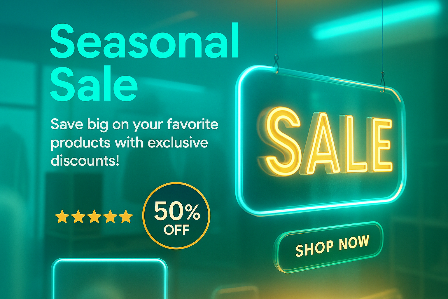 /Collection: /by davooda/Type: PNG/A vibrant seasonal sale poster featuring neon accents, showcasing a 'SALE' sign with glowing edges. The text emphasizes discounts and a call-to-action button, creating an engaging design.