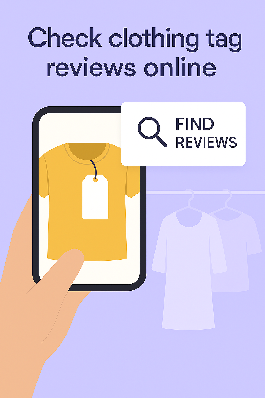 Illustrative graphic depicting a mobile app interface for checking clothing tag reviews. The design features a hand holding a smartphone with a highlighted clothing tag, suitable for fashion tech marketing.
