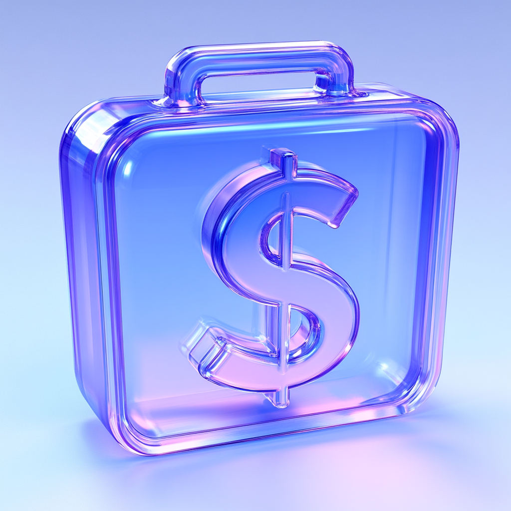 3D rendered icon of a transparent money case with a dollar sign, featuring a modern and sleek design. Ideal for financial or business-related applications.