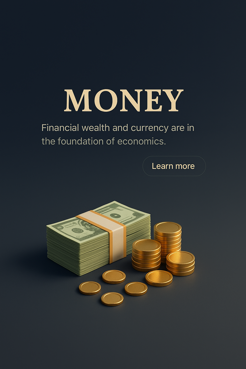 A zoomed-out 3D depiction of money, featuring a stack of cash and gold coins against a dark gradient background. Text elements are small and designed for clarity.