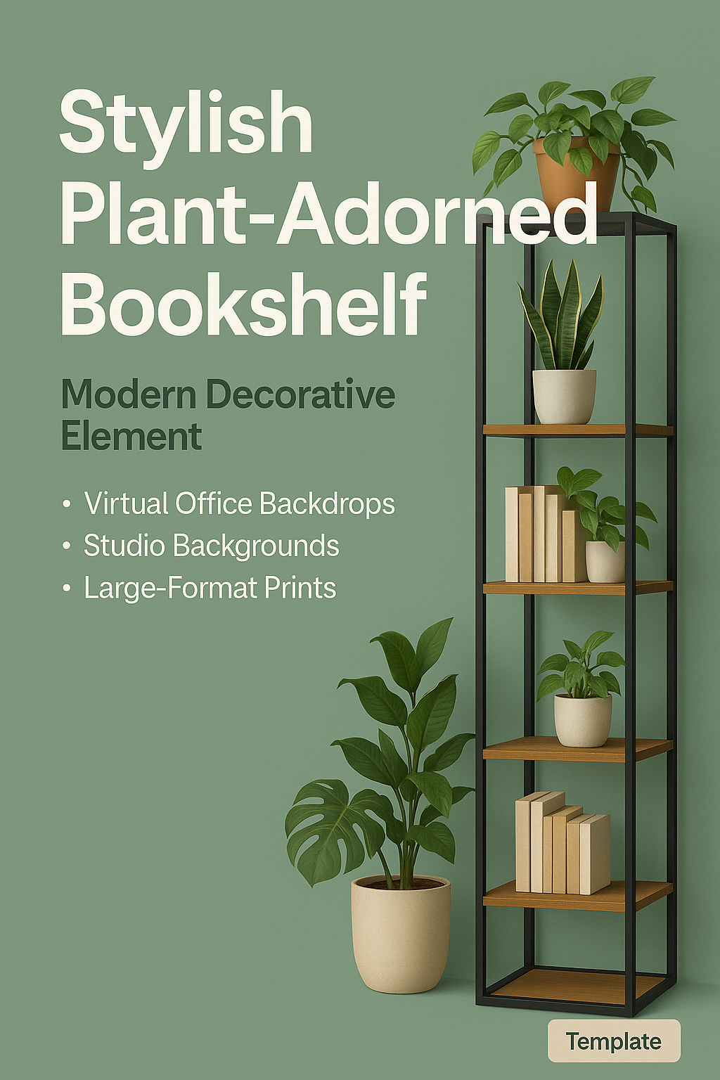 Stylish image featuring a plant-adorned bookshelf, ideal for virtual office backdrops and studio backgrounds. The design emphasizes modern aesthetics with earthy tones.
