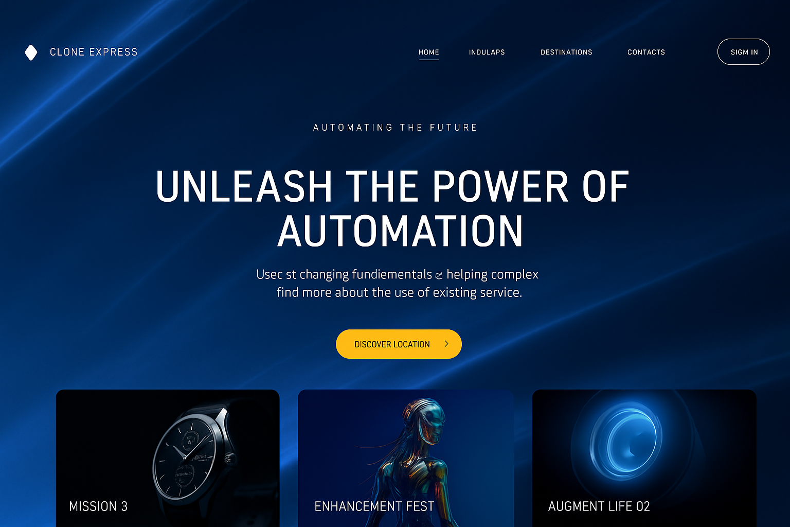 /Collection: /by davooda/Type: PNG/A modern landing page for ballet, featuring a sleek blue background with elegant diagonal lines, small typography, and dynamic elements like buttons and image blocks.