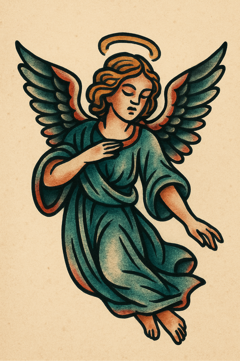 /Collection: /by davooda/Type: PNG/This image features a stylized illustration of an angel with wings and a halo, designed in a vintage art style. It may be used for religious themes or decorative purposes.