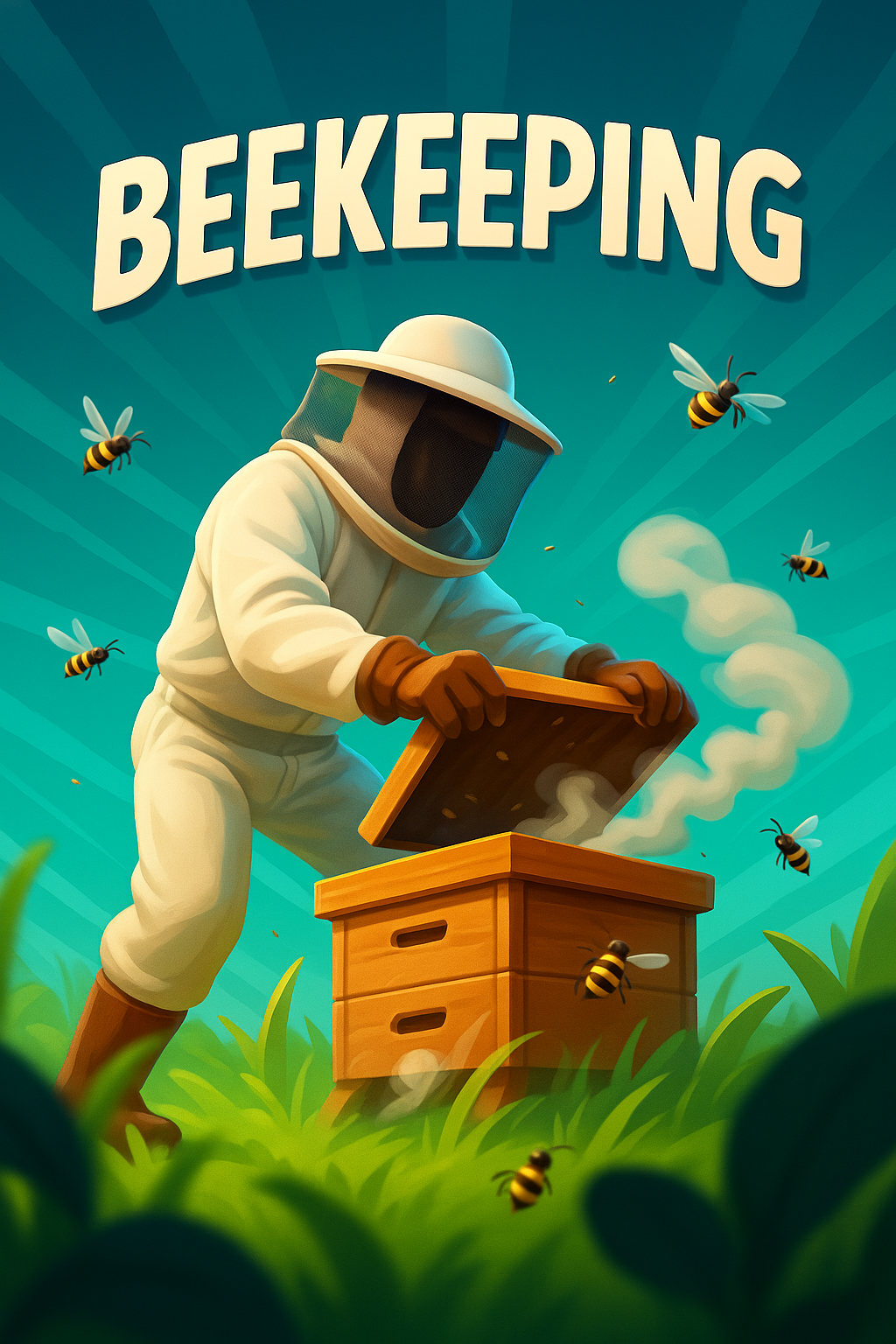 Dynamic Beekeeper Scene in Garden with Vibrant Colors