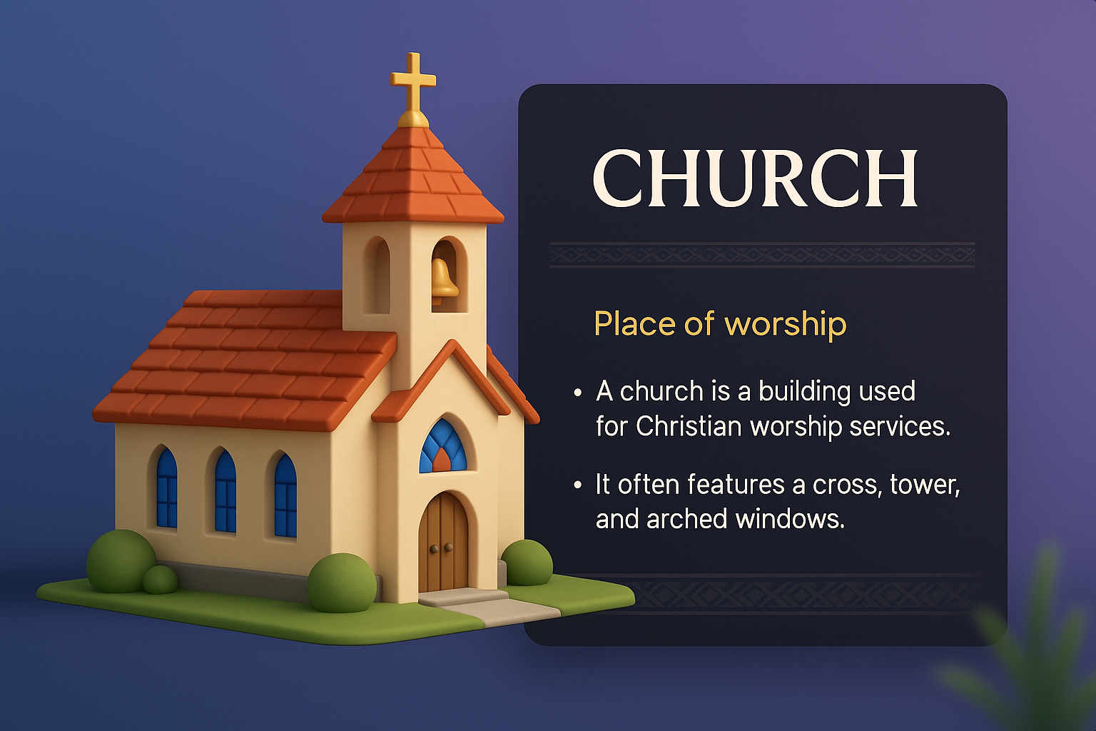 A vibrant 3D illustration of a church featuring a cross and arched windows. The design includes a dark panel with descriptive text, enhancing the visual appeal.