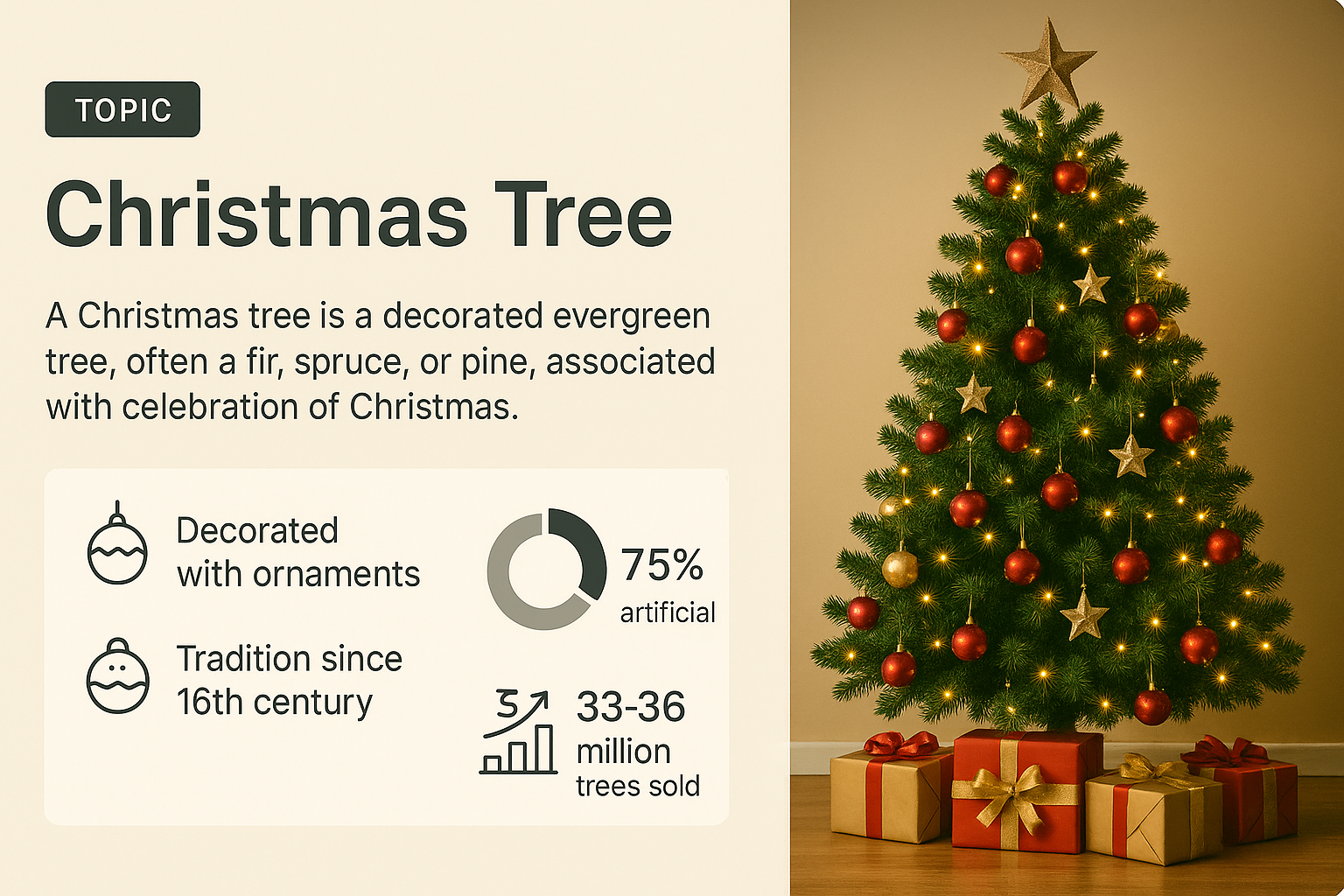An informative graphic depicting a decorated Christmas tree alongside key statistics about its tradition and sales, suitable for holiday-themed content.