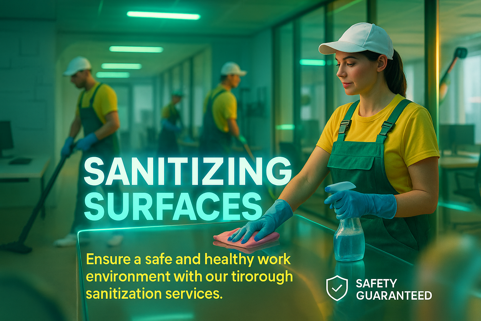A modern promotional graphic showcasing sanitation services with a focus on cleanliness and safety. Ideal for advertising in health and service industries.