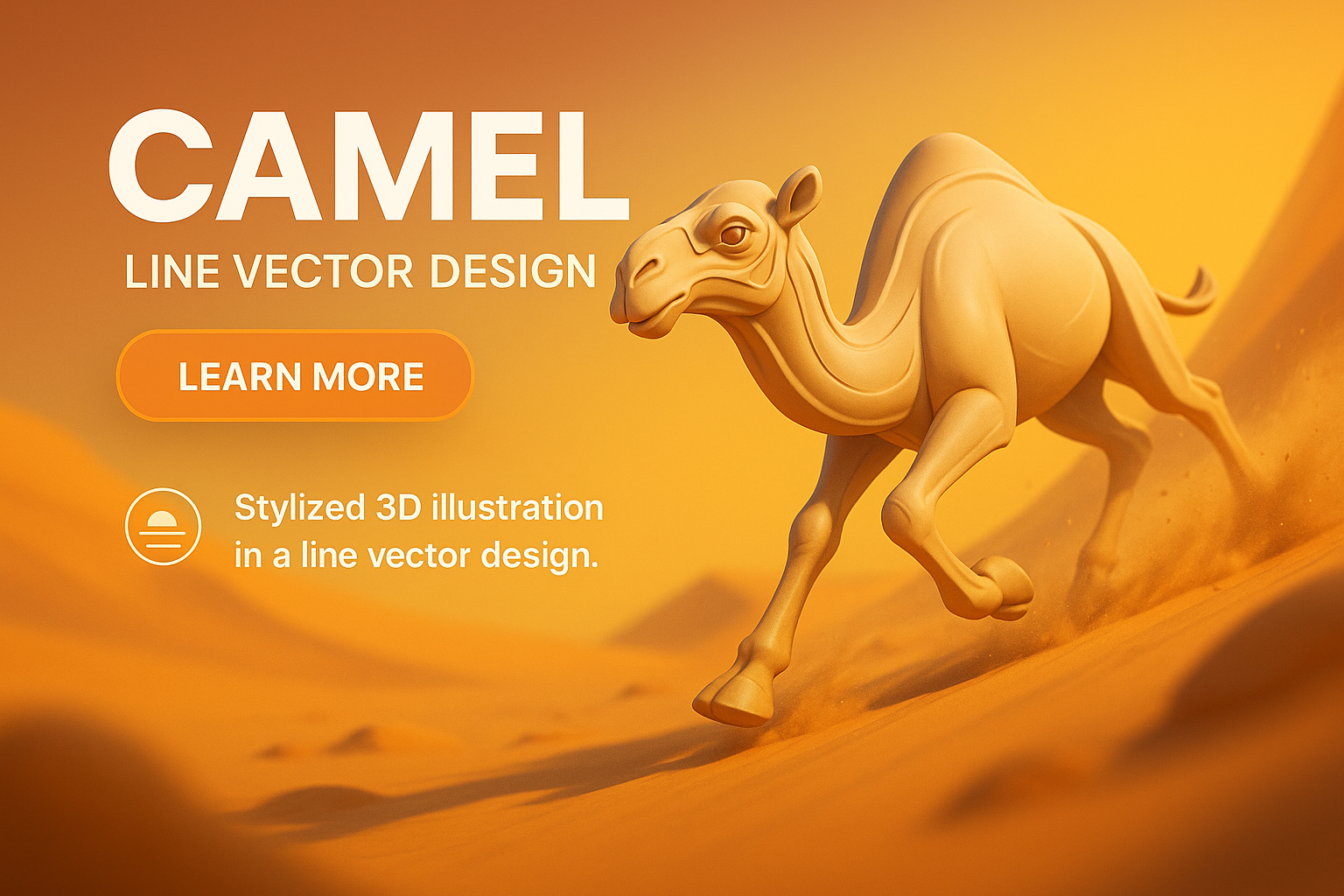 Vibrant 3D illustration of a camel set in a sandy desert landscape, showcasing a line vector design style. Perfect for educational or promotional content related to wildlife or desert themes.