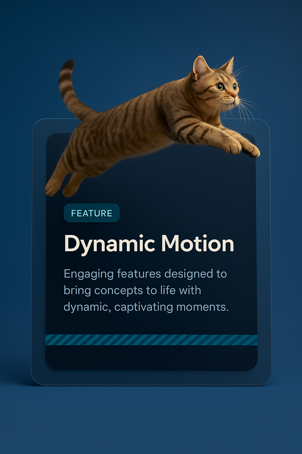 A British Shorthair cat leaps dynamically against a smooth gradient background. A feature block highlights the concept of dynamic motion, integrating seamlessly with the image.