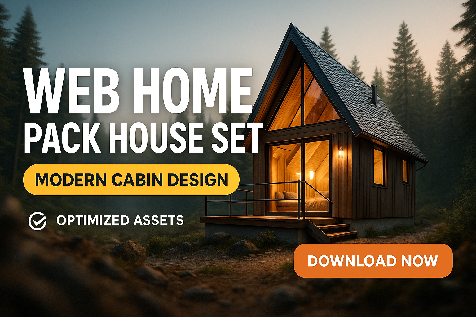 Engaging promotional graphic for a web home pack featuring a modern cabin design, ideal for architects and designers looking for optimized assets.