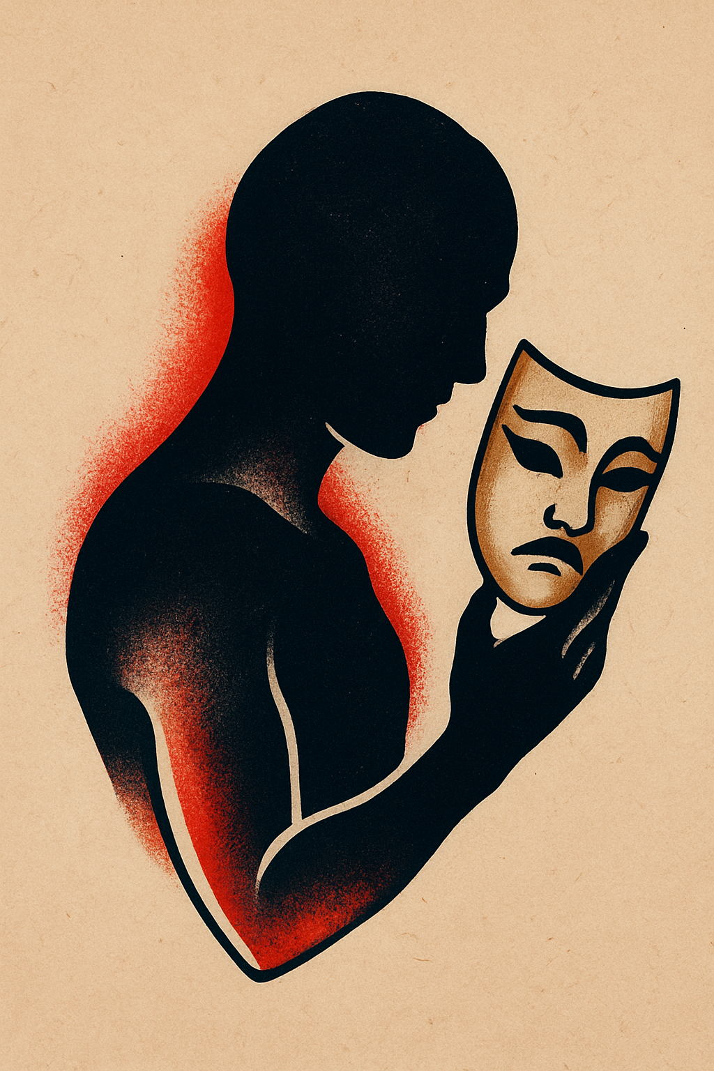 A stylized silhouette holding a mask, featuring a classic tattoo design in multiple colors against a light beige background.
