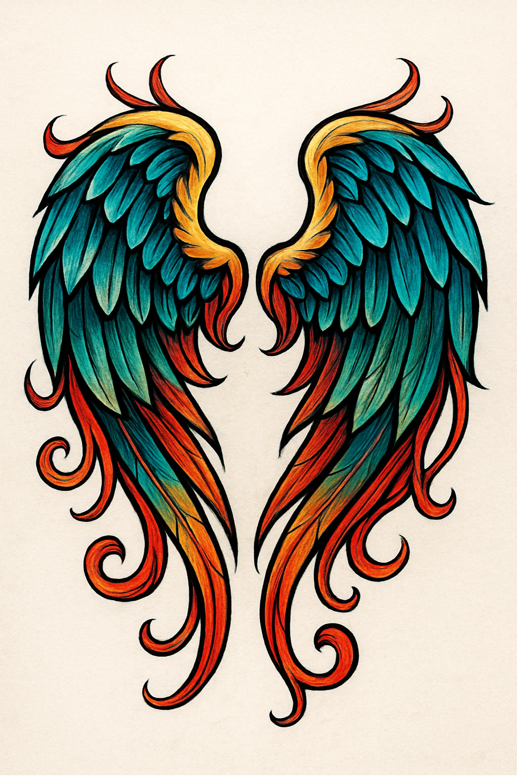 Intricate illustration of stylized wings featuring vibrant colors and flowing feather patterns. Ideal for art prints, tattoo designs, or creative projects.
