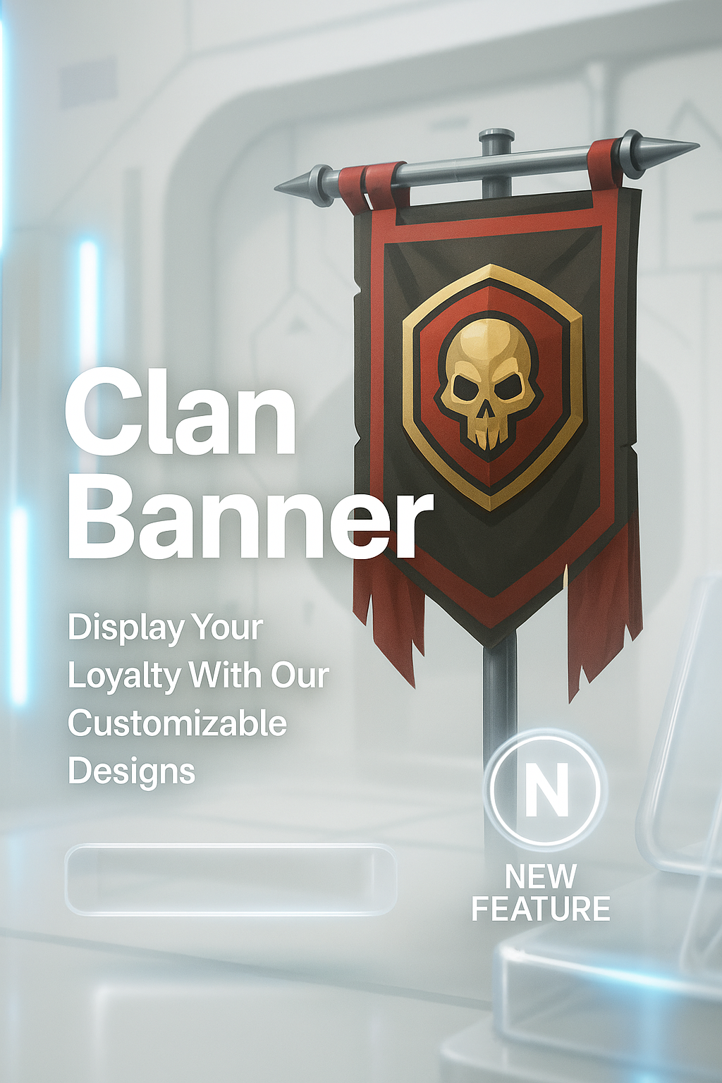 A striking clan banner design featuring a bold skull emblem. The backdrop is bright and misty, enhanced by neon accents, creating a captivating visual experience.