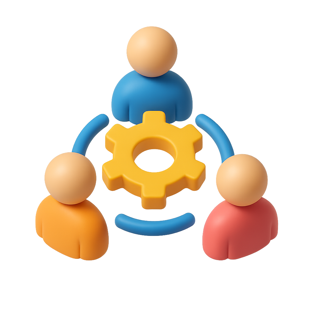 A visually engaging 3D icon featuring three stylized figures in blue, orange, and red, surrounding a central yellow gear. The design emphasizes teamwork and collaboration.
