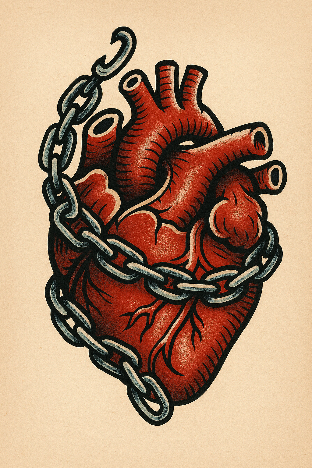 A vibrant tattoo design featuring a realistic heart wrapped in chains, with one link broken. The artwork is in multiple colors against a light beige background.