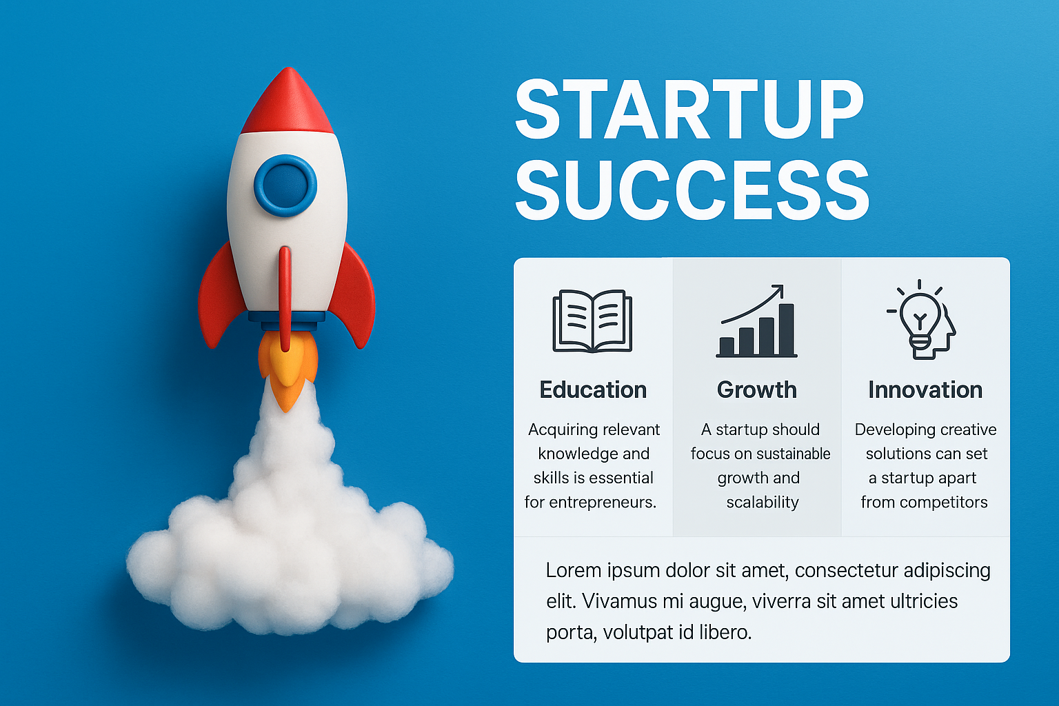 /Collection: /by davooda/Type: PNG/A visually engaging graphic featuring a rocket launching, representing startup success. The design includes sections for education, growth, and innovation, ideal for entrepreneurial presentations.