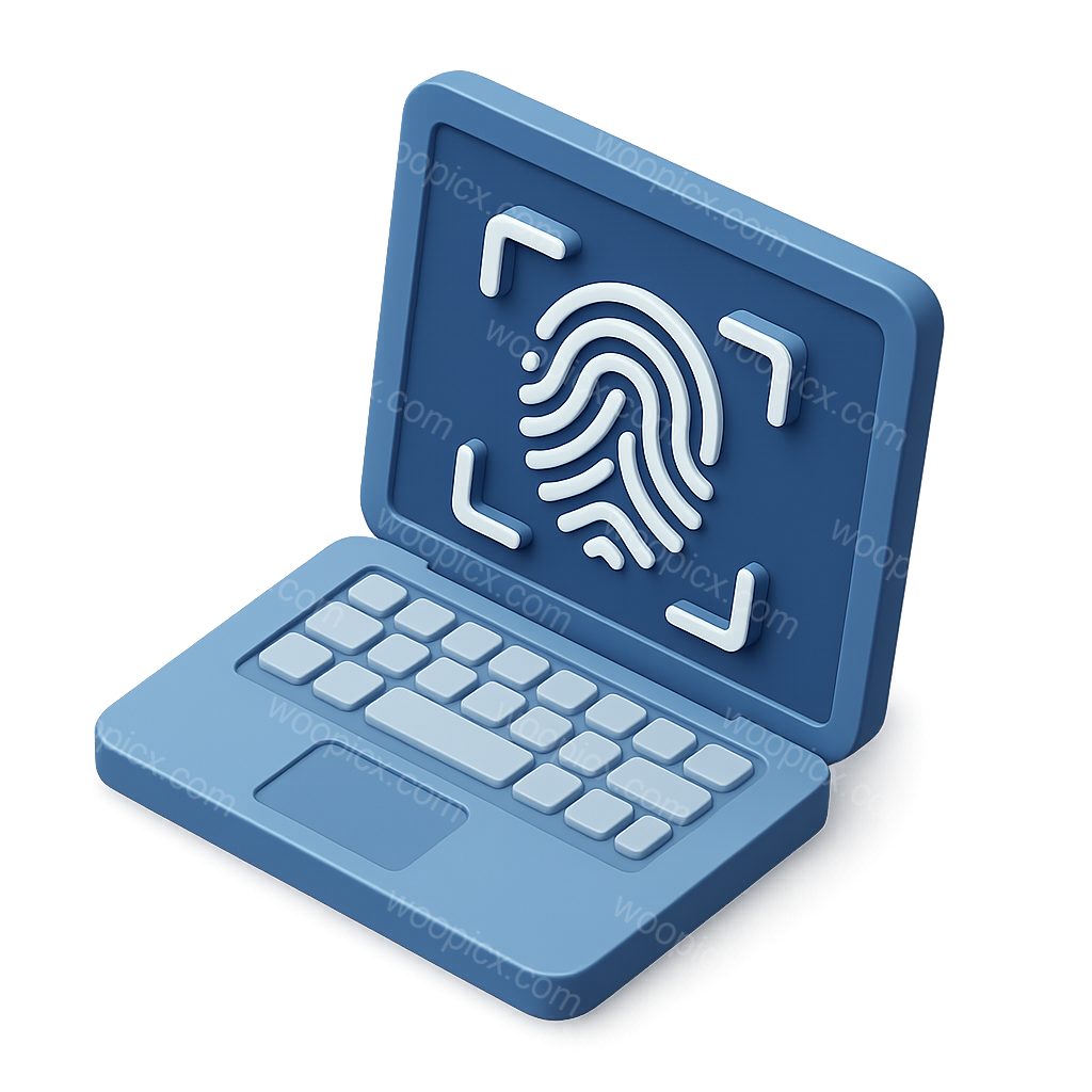 /Premium/Collection: /by davooda/Type: PNG/A 3D isometric icon depicting a laptop with a fingerprint recognition interface. The fingerprint is prominently displayed on the screen with a modern design.