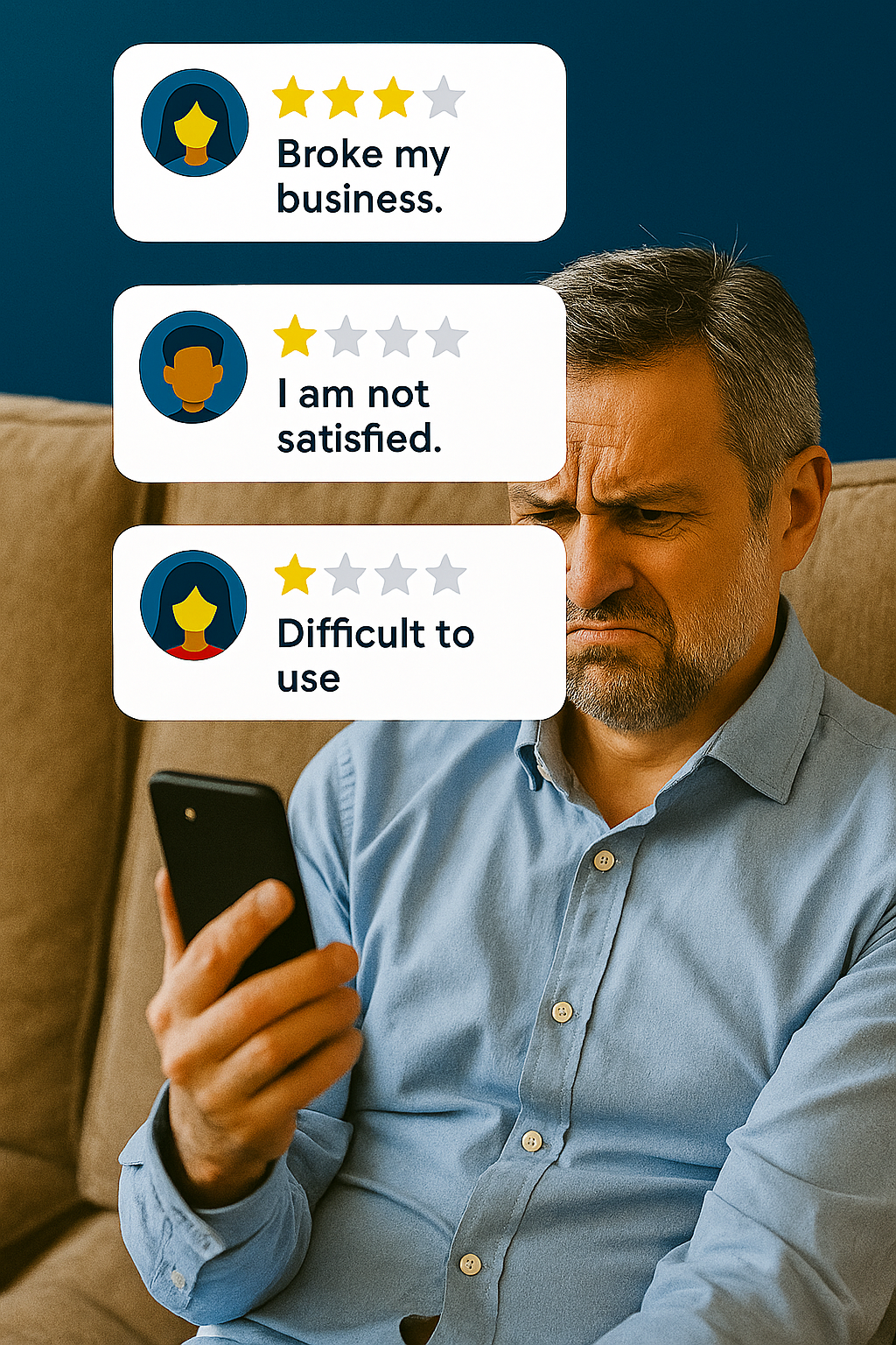 /Collection: /by davooda/Type: PNG/A conceptual graphic depicting a frustrated man reviewing negative feedback on his phone, highlighting customer dissatisfaction. Ideal for illustrating service-related challenges.