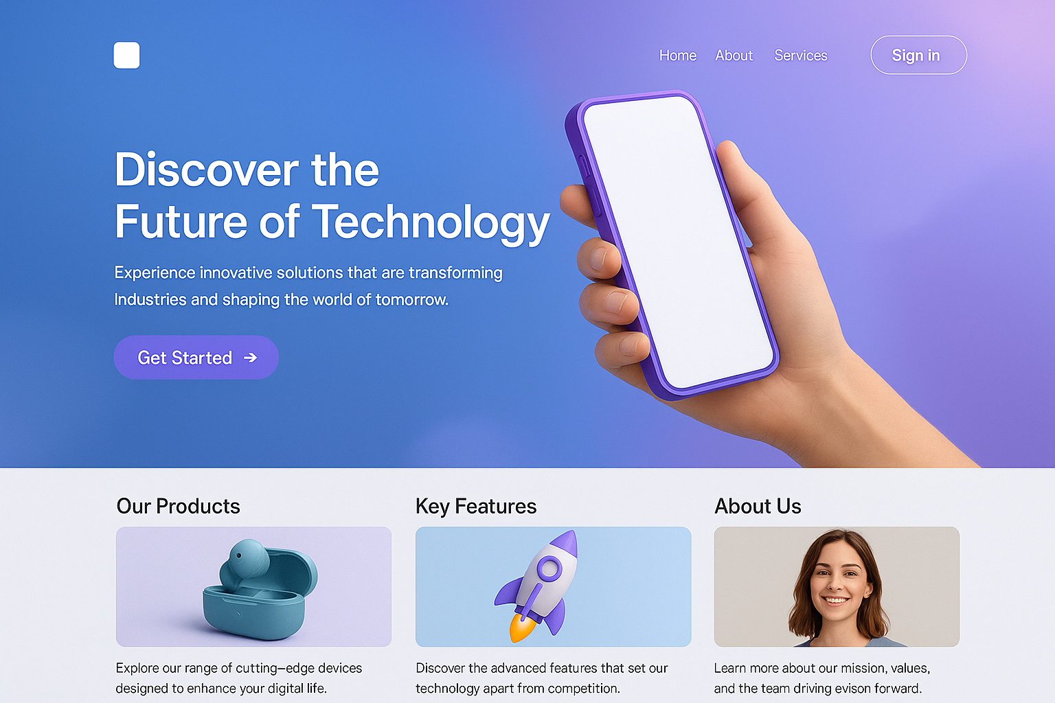 A visually appealing layered landing page design showcasing technology solutions. Features a purple phone, 3D illustrations, and a clean gradient background.