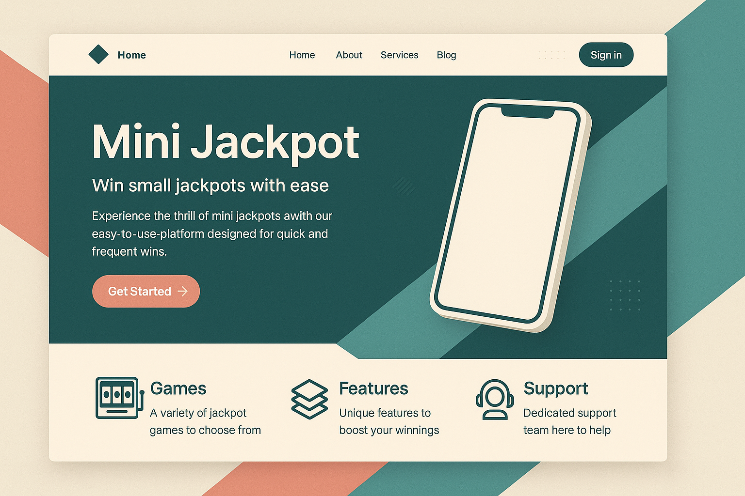 A visually engaging landing page design for 'Mini Jackpot', featuring a smartphone mockup, geometric shapes, and a clean layout with sections for games, features, and support.
