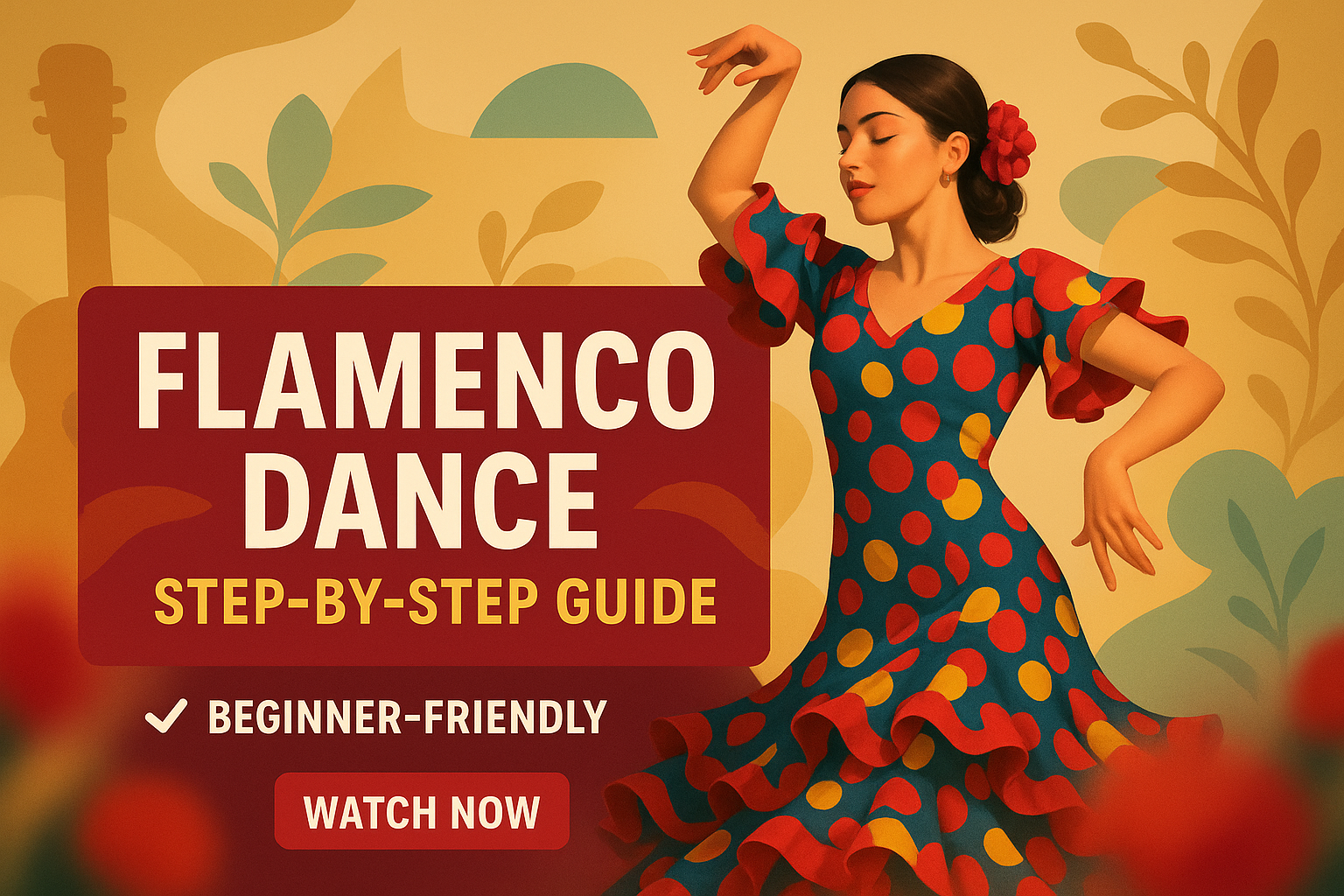 Colorful promotional graphic for a flamenco dance tutorial, showcasing a dancer in a vibrant polka dot dress. Ideal for attracting beginners interested in dance.
