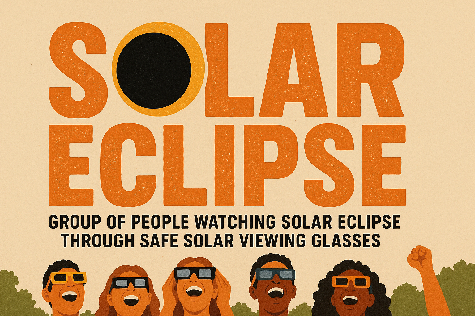 /Collection: /by davooda/Type: PNG/Vibrant graphic illustrating a diverse group of people observing a solar eclipse with protective glasses, perfect for educational or promotional content related to astronomy.