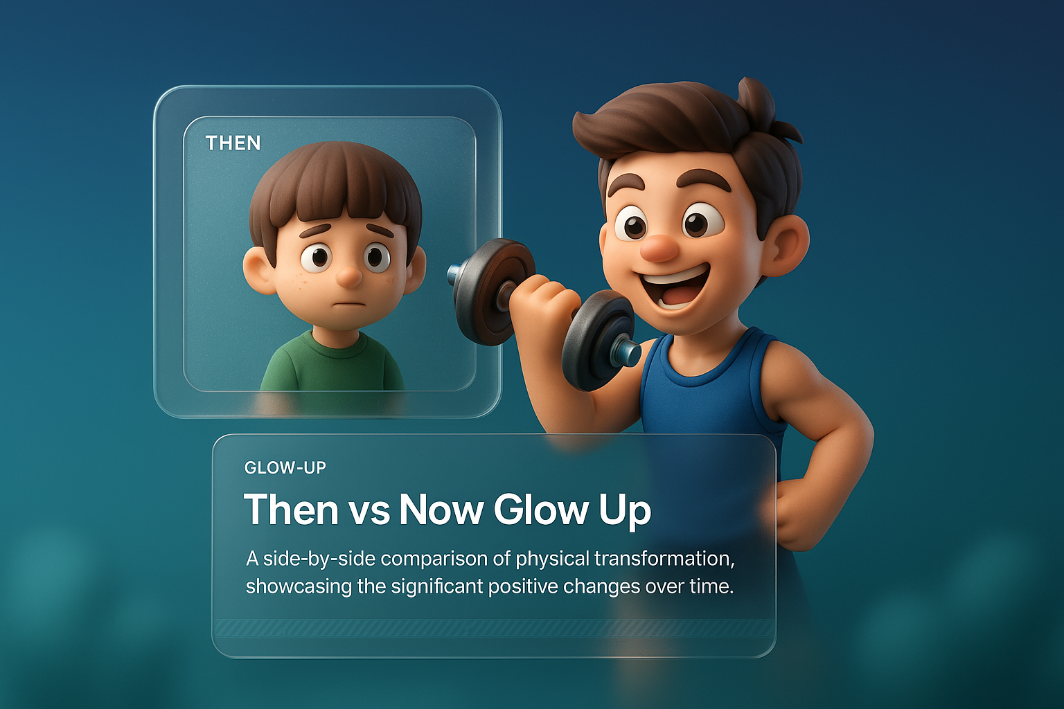A vibrant 3D illustration depicting a before-and-after transformation. The left side shows a sad character, while the right side features a confident character holding dumbbells, emphasizing positive growth.
