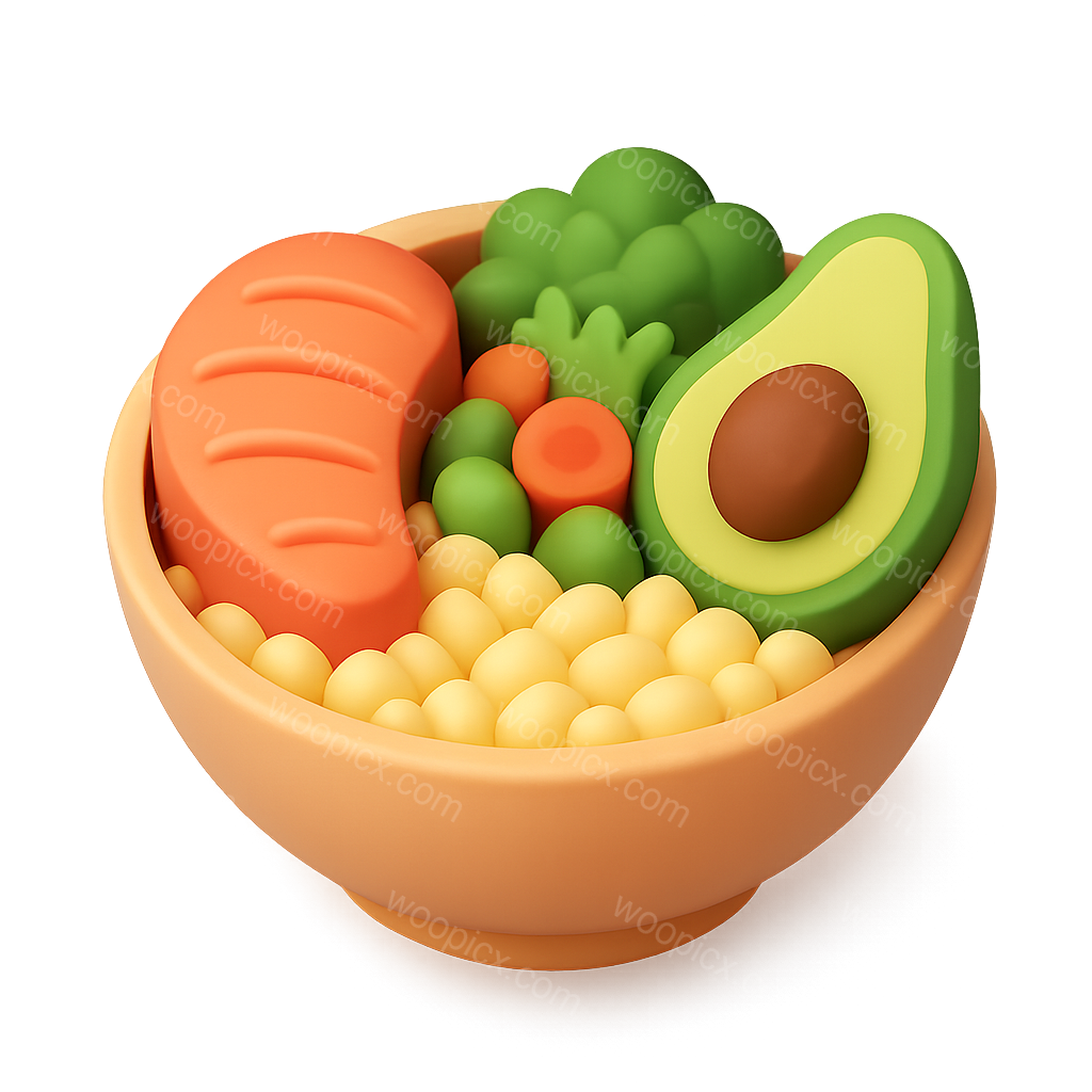 A vibrant 3D bowl filled with an assortment of food items including a piece of salmon, avocado, and various vegetables, designed in an isometric style.