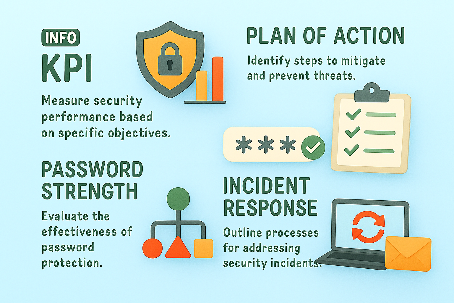 /Collection: /by davooda/Type: PNG/A visually engaging infographic that outlines key cybersecurity concepts such as KPI, password strength, incident response, and action plans. Ideal for educational purposes in cybersecurity training.