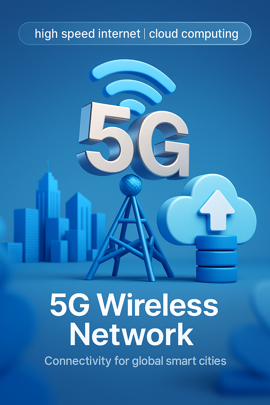 /Collection: /by davooda/Type: PNG/A visually engaging 3D illustration depicting a 5G wireless network tower, cloud computing elements, and a city skyline, emphasizing high-speed internet and global connectivity.