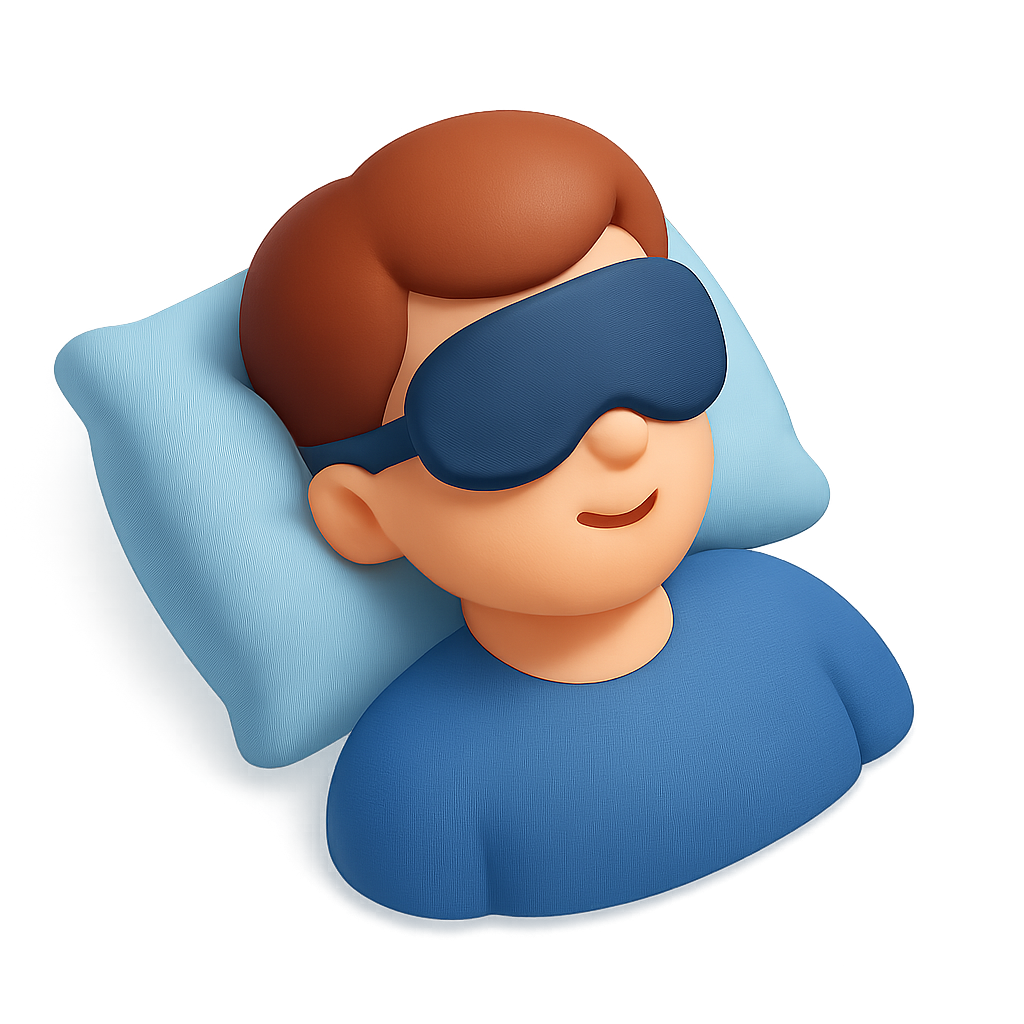 A stylized 3D icon depicting a person peacefully sleeping while wearing a sleep mask, set against a soft gradient background. The character features a relaxed expression, showcasing a comfortable pillow.