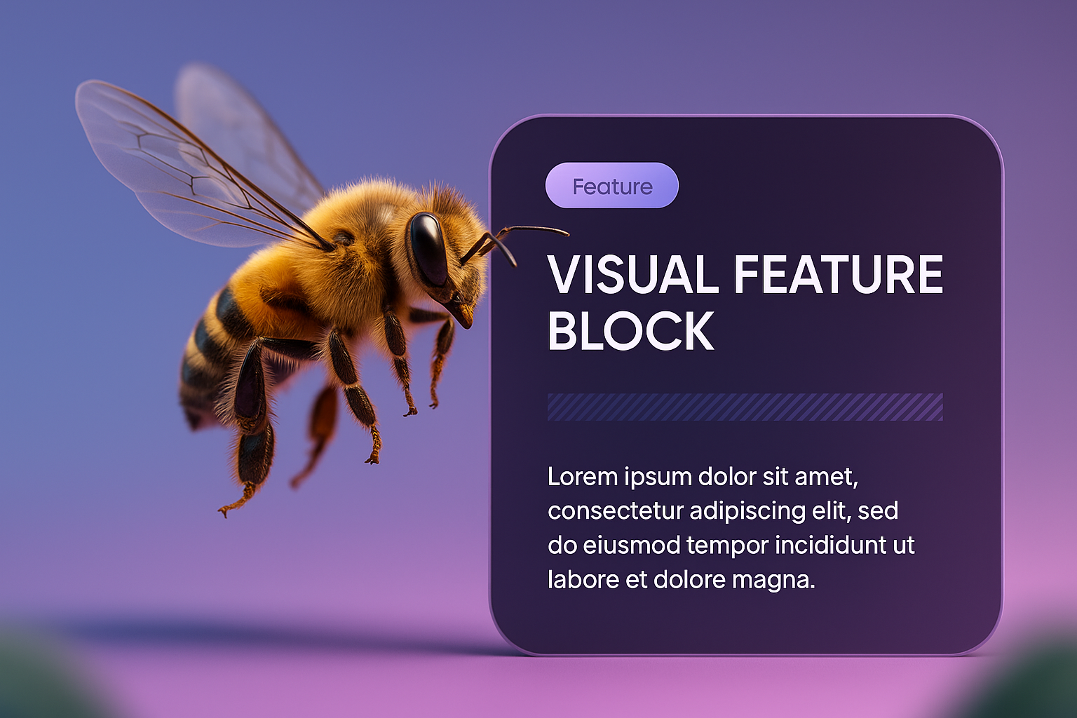A realistic 3D illustration of a honey bee landing, accompanied by a stylish purple feature block. The background transitions smoothly, emphasizing the main subject.