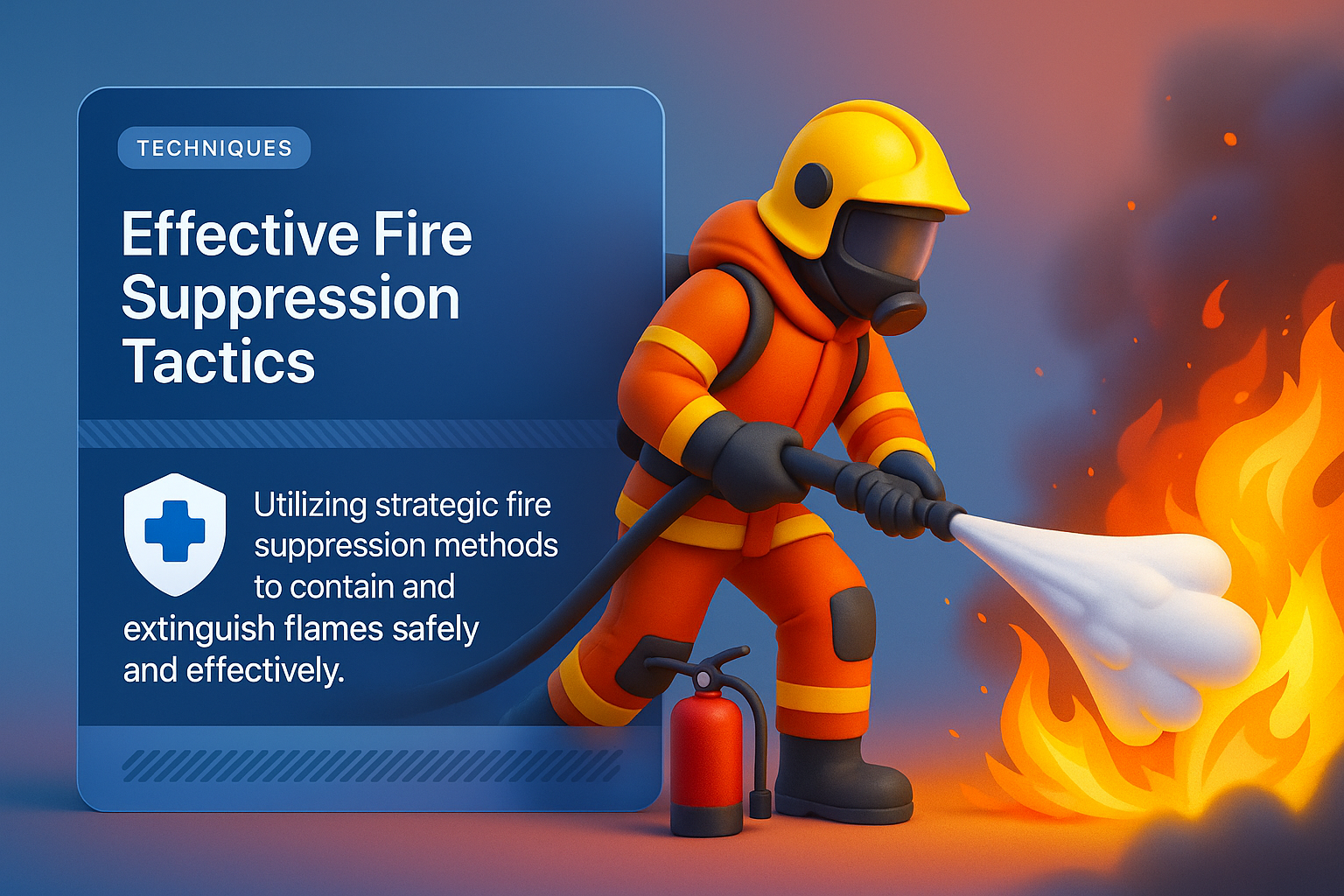 A 3D illustration of a firefighter in action, using a fire extinguisher to combat flames. The scene emphasizes safety with the firefighter in protective gear, showcasing effective fire suppression tactics.