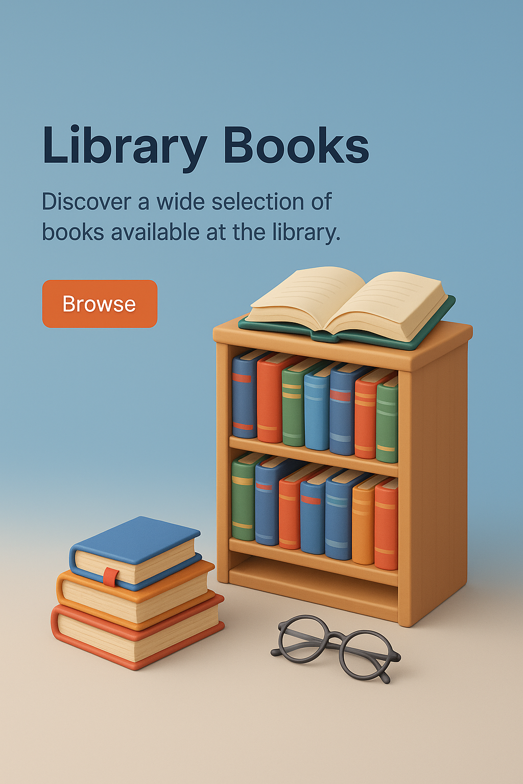 A detailed 3D illustration of a library scene featuring a bookshelf filled with colorful books, an open book, and reading glasses. The background has a smooth gradient, presenting a cohesive design.