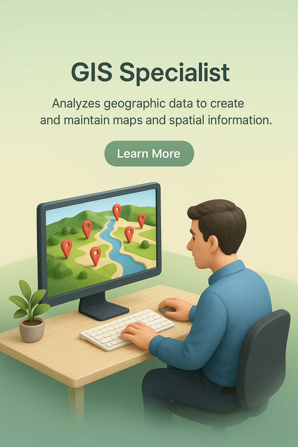 /Collection: /by davooda/Type: PNG/A 3D illustration of a GIS specialist analyzing geographic data on a computer. The scene shows a monitor displaying a map with location markers, set in a minimalist office environment.