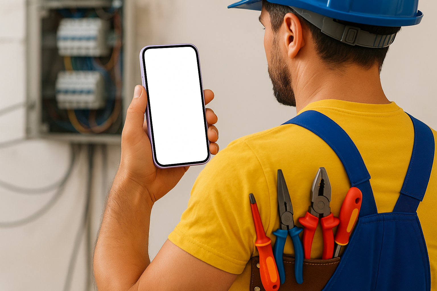 /Collection: /by davooda/Type: PNG/A man dressed as an electrician, holding a purple phone with a white screen. He has various tools visible in his pocket, with a background showing electrical equipment.