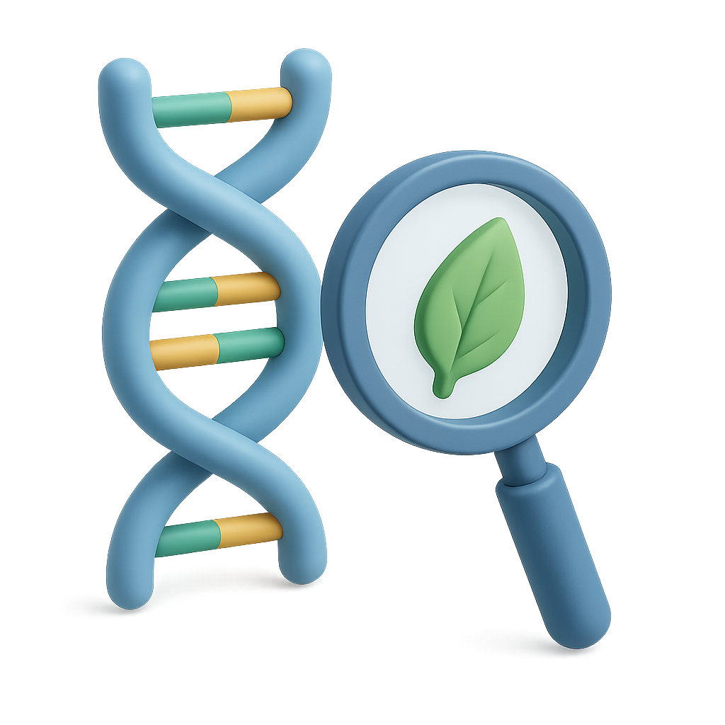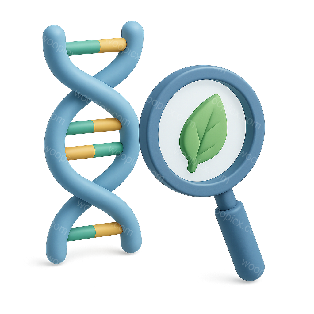 A three-dimensional bio-tech icon showcasing a DNA helix alongside a magnifying glass with a leaf. The image has a transparent background and a modern isometric design.