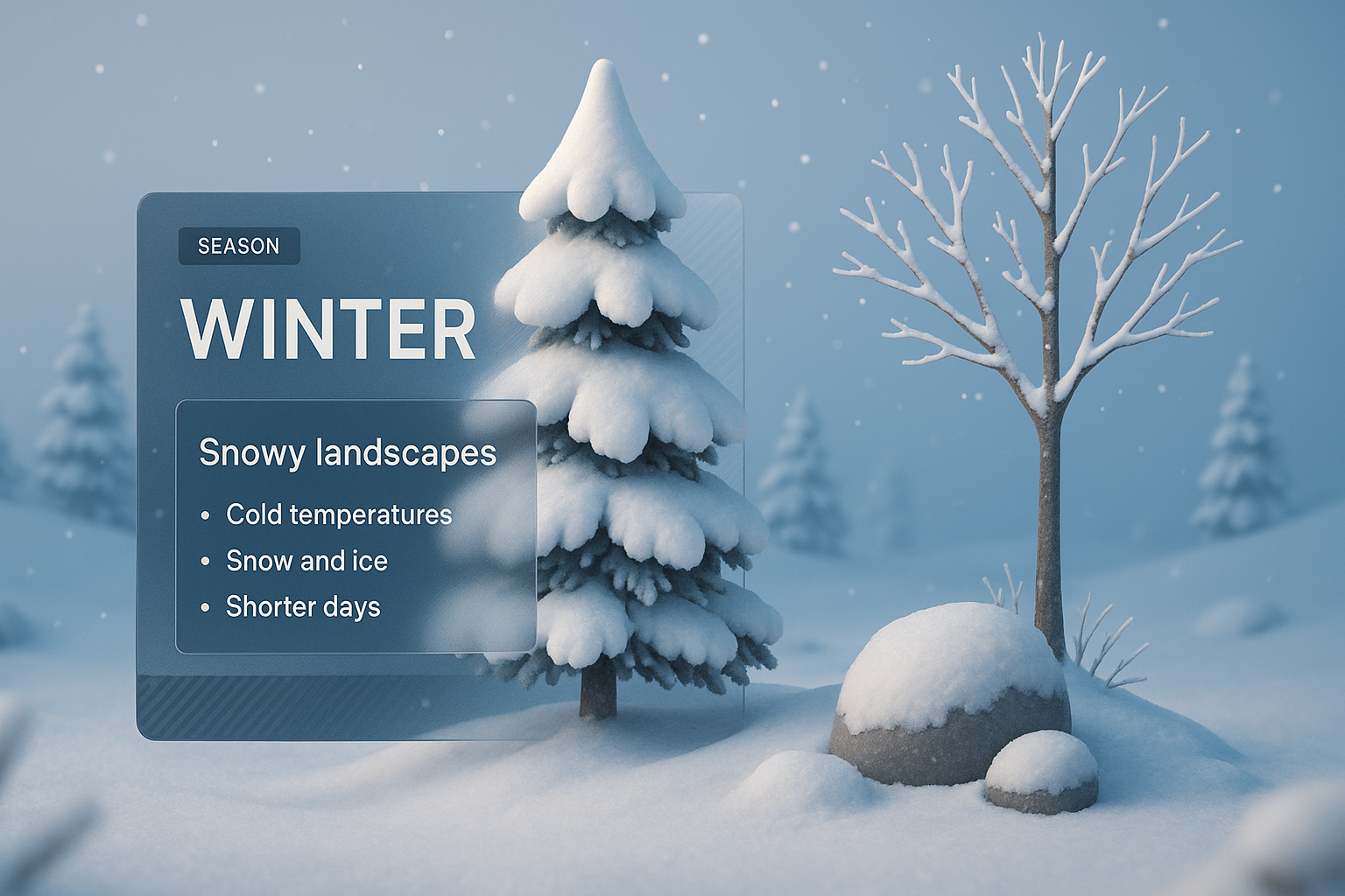 A captivating 3D illustration depicting a winter landscape featuring a snow-covered tree, rocks, and a transparent panel displaying seasonal information about winter. The scene conveys a serene and cold atmosphere.