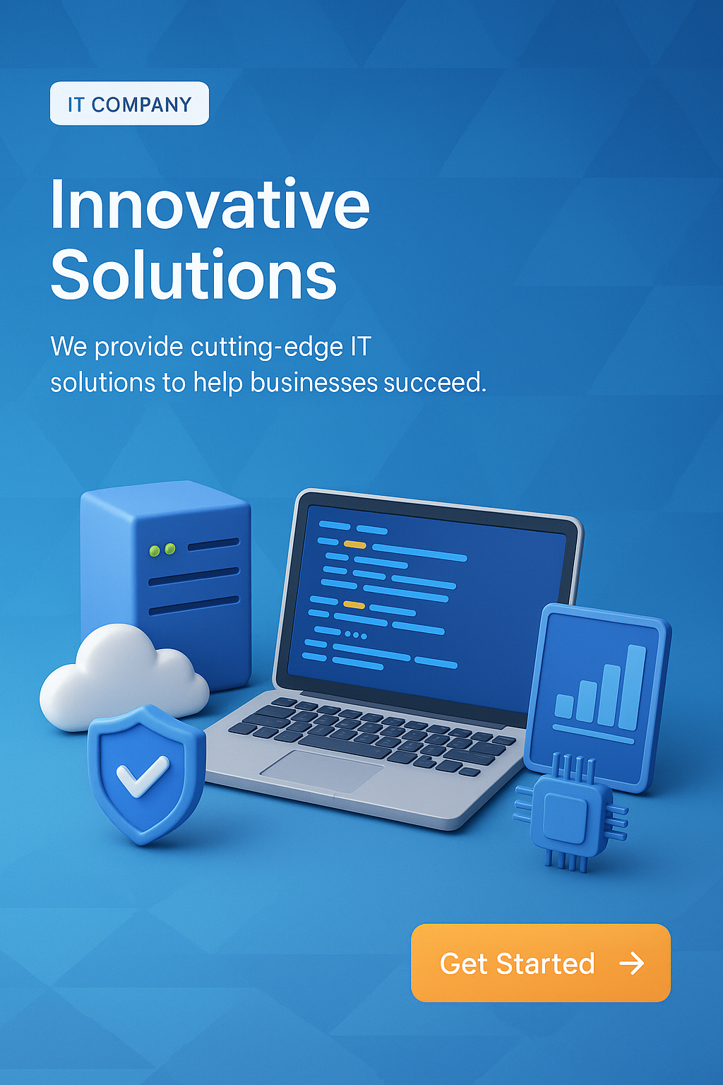 A zoomed-out view of a 3D illustration featuring a laptop, server, cloud, and shield, set against a blue triangle background, emphasizing innovative IT solutions.