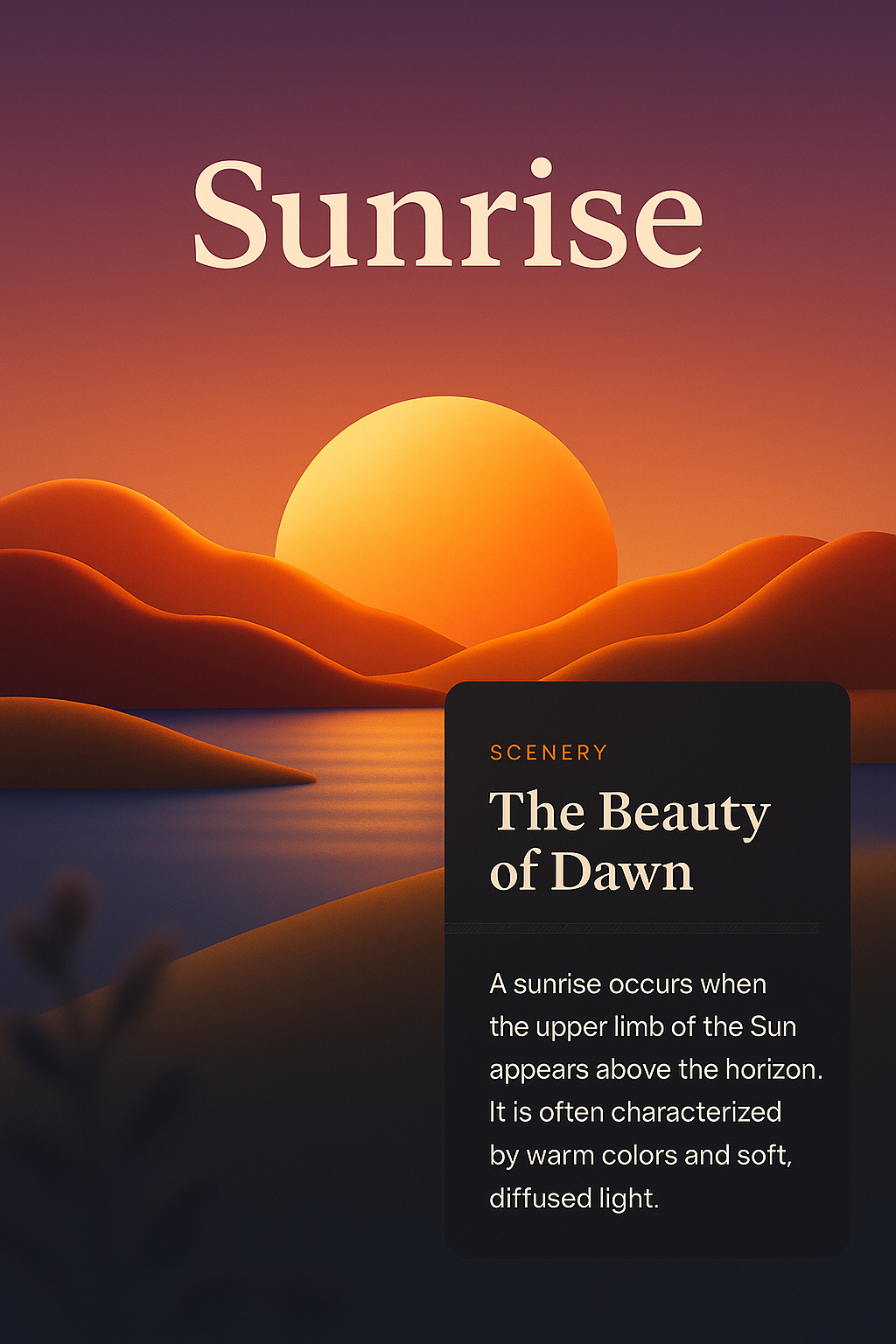 /Collection: /by davooda/Type: PNG/A captivating 3D illustration of a sunrise, featuring warm colors and soft gradients. The scene includes layered hills and a sun emerging above the horizon, complemented by a dark text block.