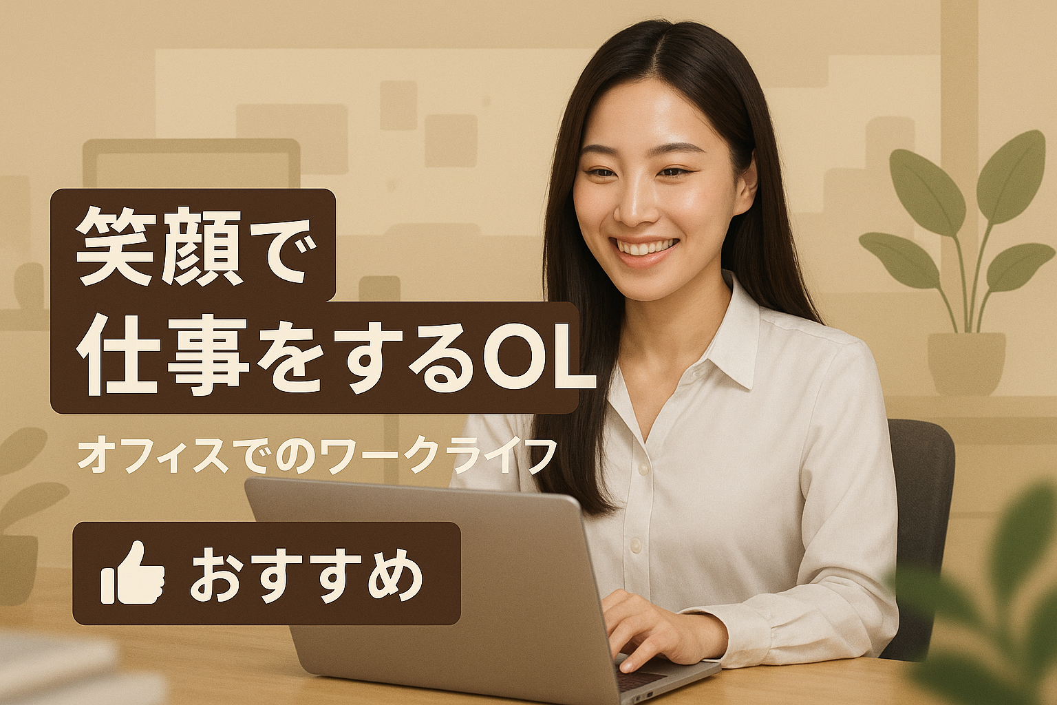 A vibrant image depicting a young woman smiling while working on a laptop in a cozy office environment, ideal for promoting remote work and positivity.