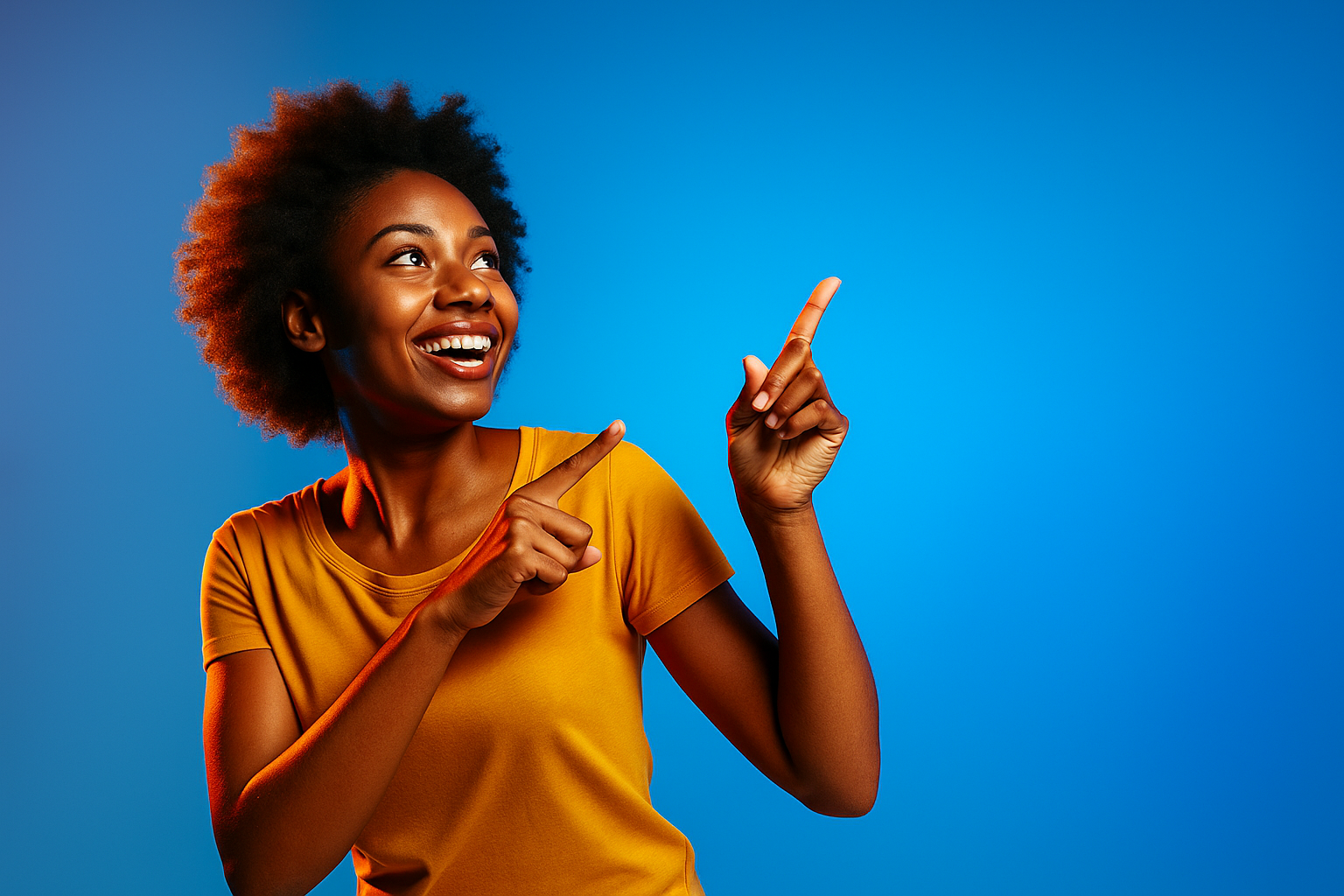 /Collection: /by davooda/Type: PNG/A beautiful young black woman with an afro hairstyle is joyfully pointing upwards against a vibrant blue background. Her expression exudes happiness and satisfaction, making it ideal for advertising.