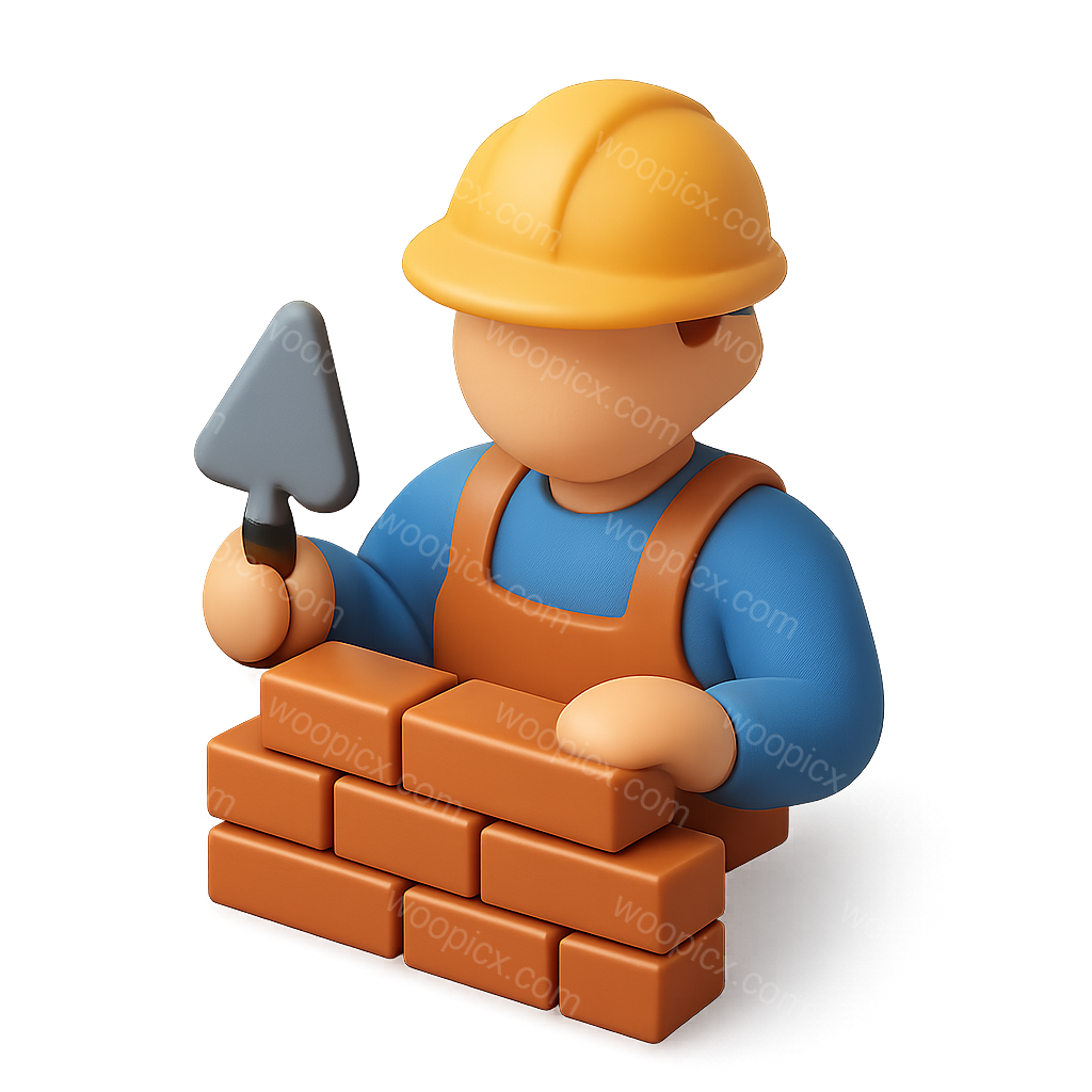 A stylized 3D icon of a bricklayer in a three-quarter view, wearing a yellow hard hat and blue shirt, holding a trowel with a brick wall structure.
