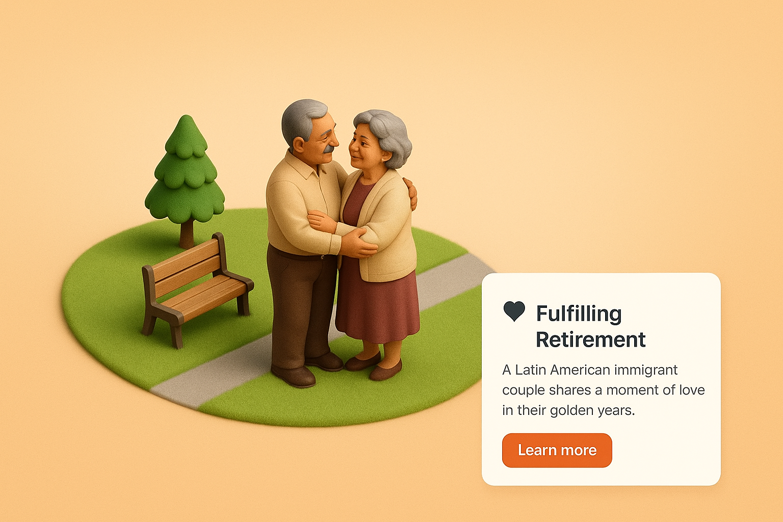 /Collection: /by davooda/Type: PNG/A heartwarming 3D scene depicting an elderly Hispanic couple embracing in a park setting, showcasing their love and joy in retirement. The background features a smooth gradient and simple elements.