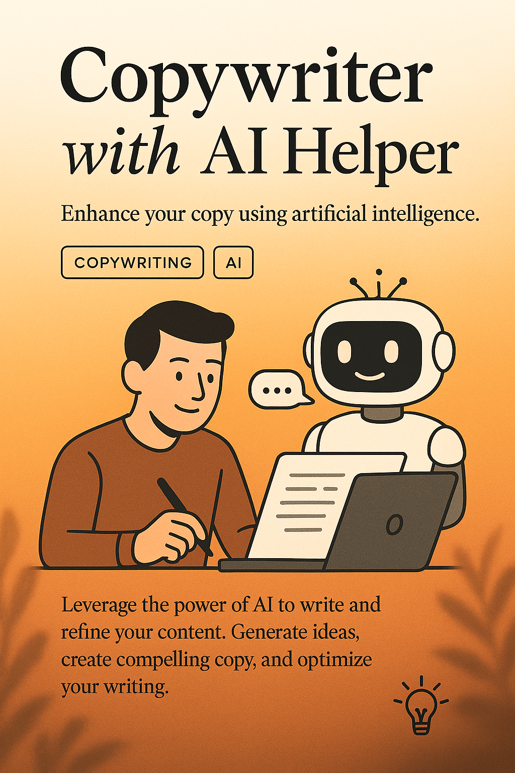 /Collection: /by davooda/Type: PNG/An illustration depicting a copywriter collaborating with an AI helper, set against a gradient background. The design features harmonious typography, contrasting elements, and a clear visual hierarchy.