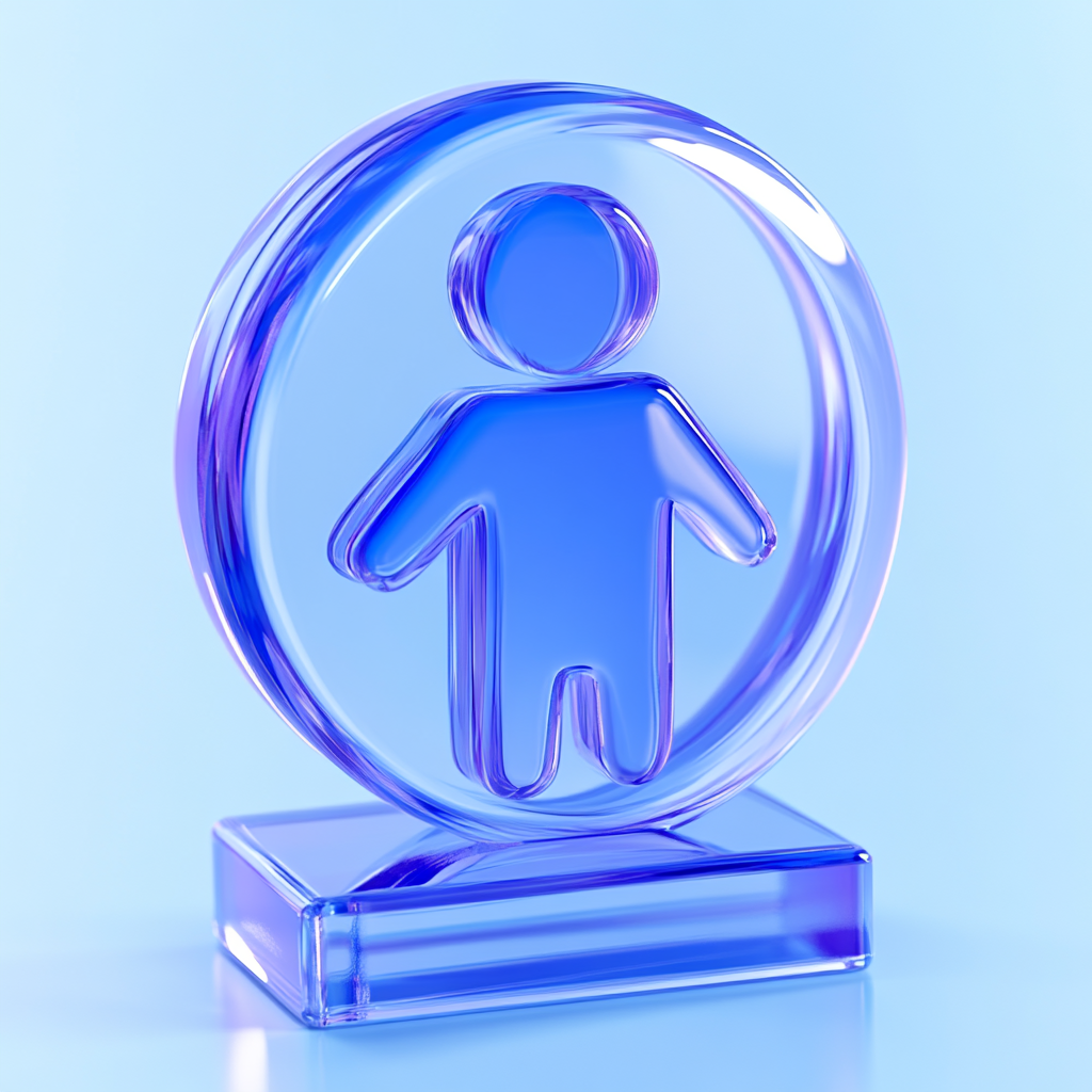 A modern glass icon representing a person, highlighted in gradient blue hues. Ideal for digital interfaces, user profiles, or website design elements.