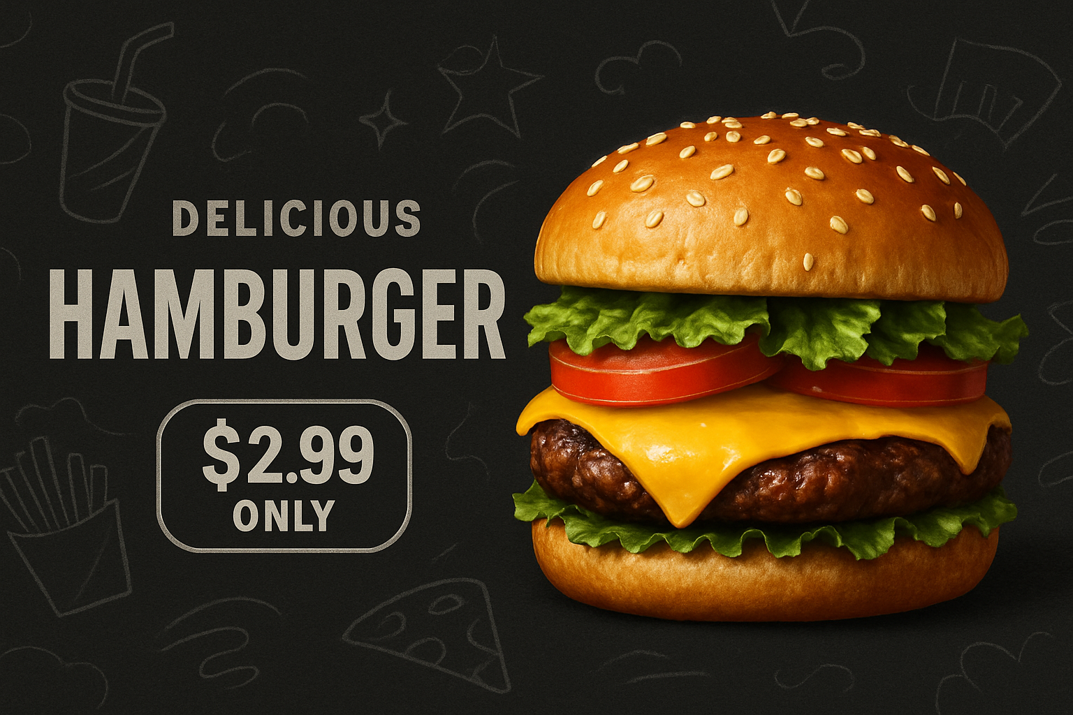 /Collection: /by davooda/Type: PNG/A vibrant advertisement featuring a delicious hamburger against a textured dark background. The layout includes bold typography and a price tag, creating an energetic appeal.