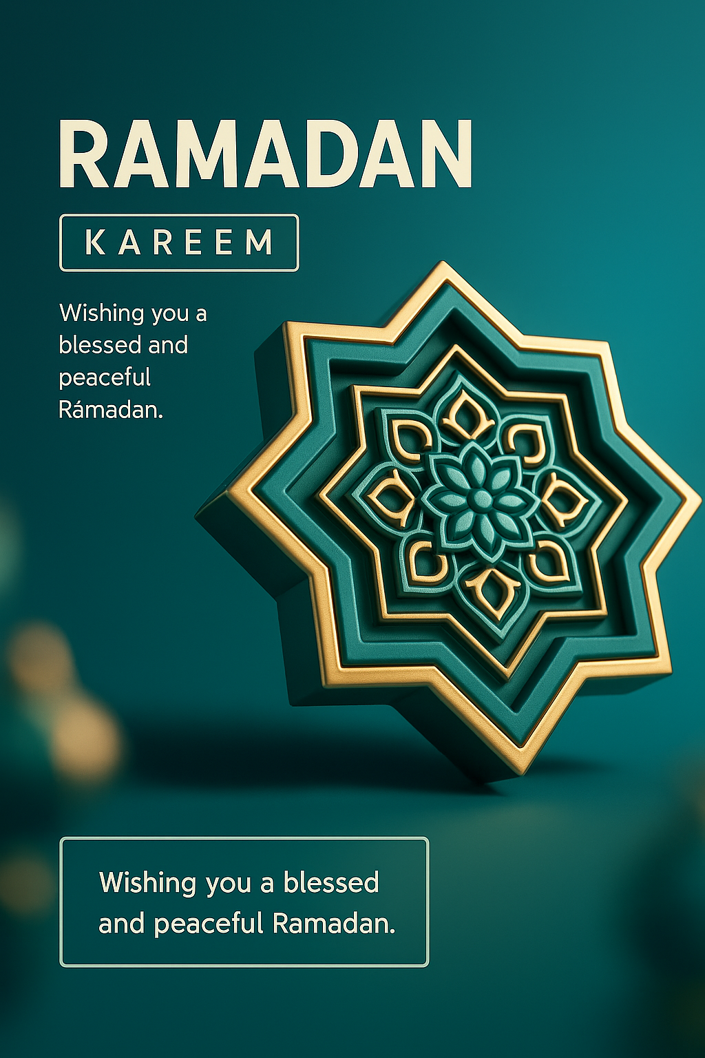 A visually striking 3D illustration of an Islamic ornament representing Ramadan, featuring a gradient background and layered text for a cohesive design.
