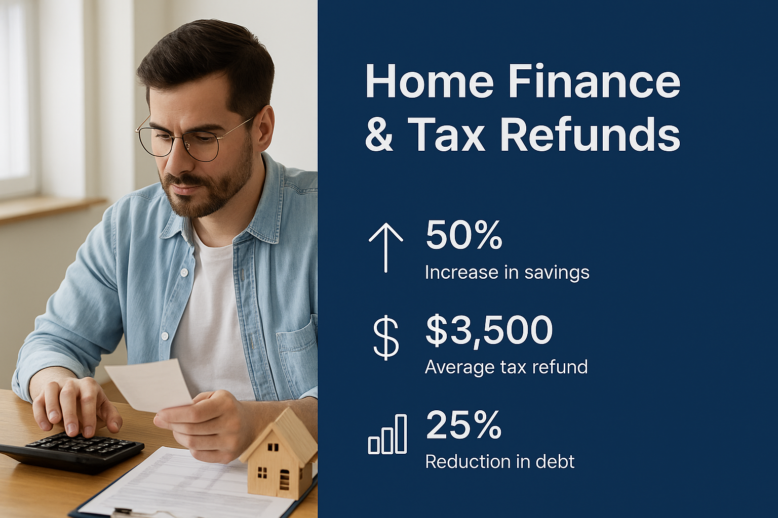 Informative infographic focusing on home finance and tax refunds, featuring key statistics in a modern design suitable for financial advice platforms.