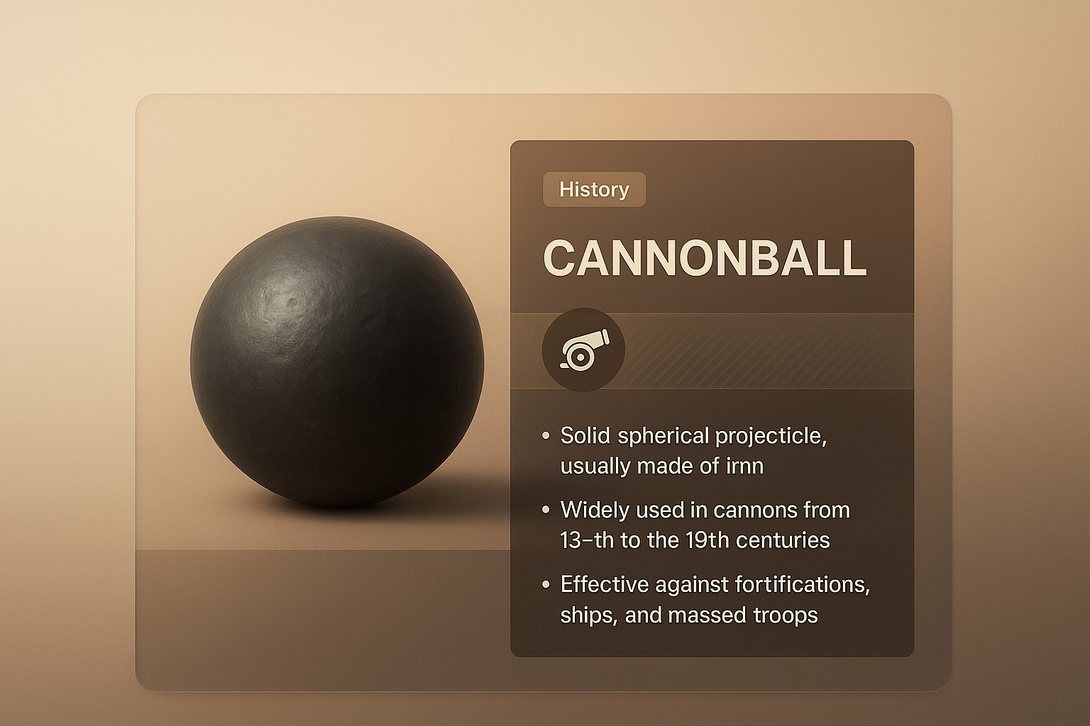 /Collection: /by davooda/Type: PNG/This image showcases a 3D cannonball placed against a smooth gradient background. A translucent information block contains key details about the cannonball's historical use, enhancing the visual appeal.